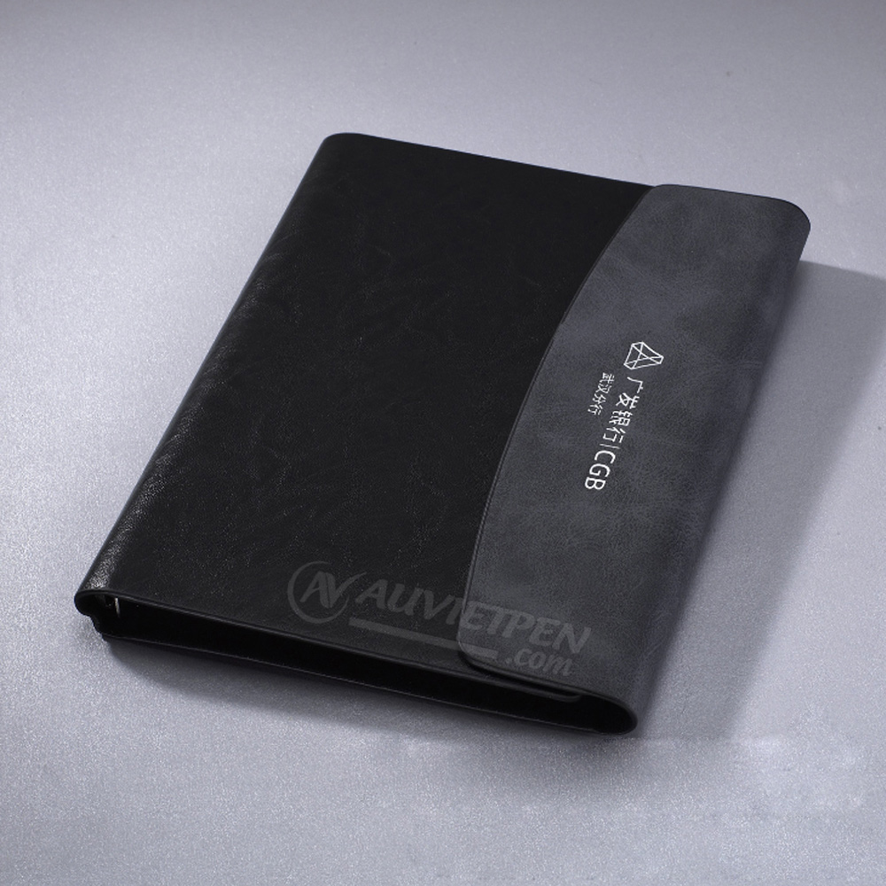 Sổ còng 6 lỗ chắc chắn, sáng bóng. Màu đen kết hợp bìa cài màu nâu cho cuốn sổ sự mới lạ và khác biệt. Bề mặt da PU có thể in dập logo lên mặt sổ. Gài name card và gài bút thiết kế bên trong bìa sổ.