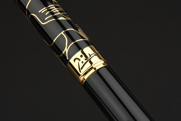 Nắp bút ký cao cấp Picasso 902RG nổi bật với những họa tiết hoa văn được chạm nổi màu vàng trên nền đen của nắp bút.
