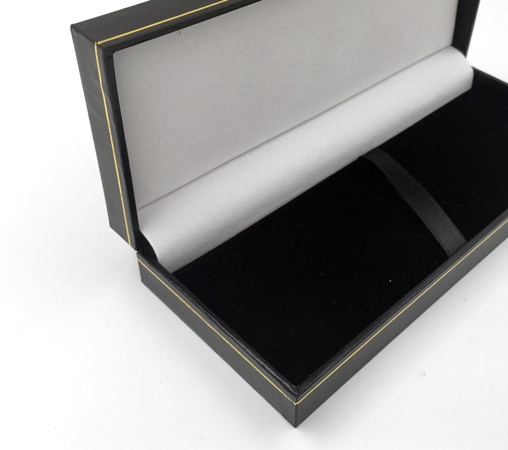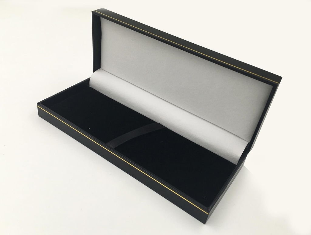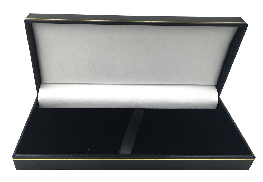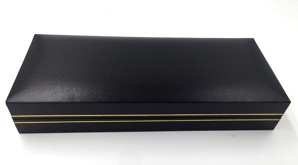 Hộp đựng bút cao cấp sang trọng bên ngoài bọc giả da màu đen, cạnh hộp có viền màu vàng tạo nên điểm nhấn cho sản phẩm. Bên trong hộp bút được lót vải nhung màu trắng (nắp hộp) và màu đen (thân hộp), có sợi dây để giữ cây bút cố định sau khi đặt vào hộp.