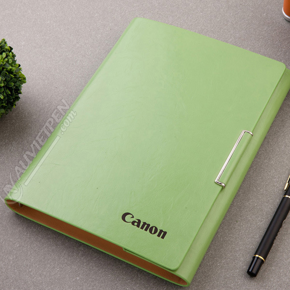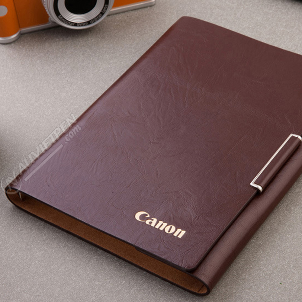 Điểm nhấn cuốn sổ chính là bản khuy kim loại sáng bóng ở cạnh, cho cảm giác sang trọng và tránh đơn điệu cho cuốn sổ. Bề mặt sổ có thể dập logo thương hiệu để quảng bá cho doanh nghiệp hay các sự kiện.