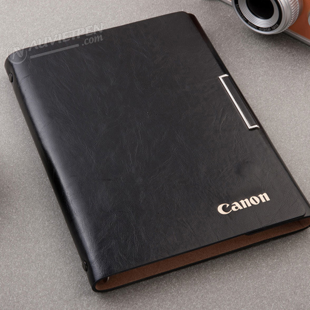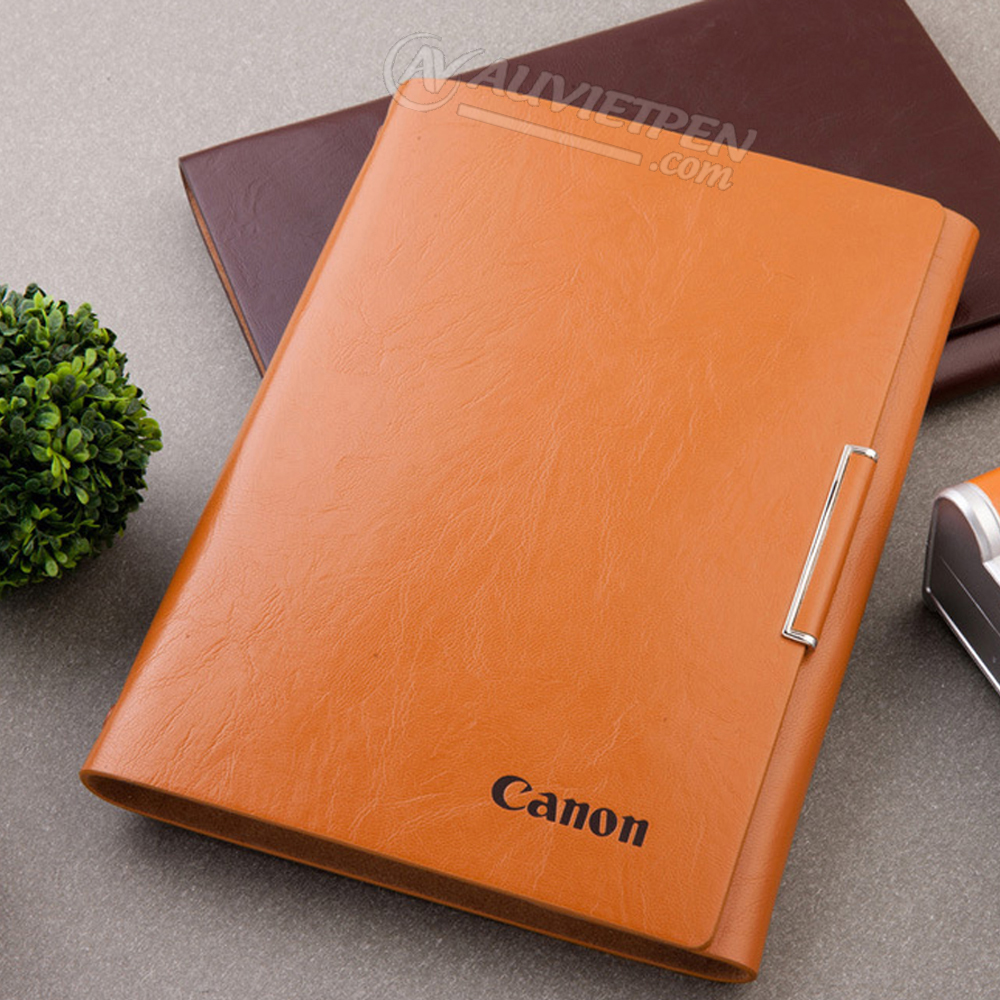Điểm nhấn cuốn sổ chính là bản khuy kim loại sáng bóng ở cạnh, cho cảm giác sang trọng và tránh đơn điệu. Bề mặt sổ có thể dập logo thương hiệu để quảng bá cho doanh nghiệp hay các sự kiện.