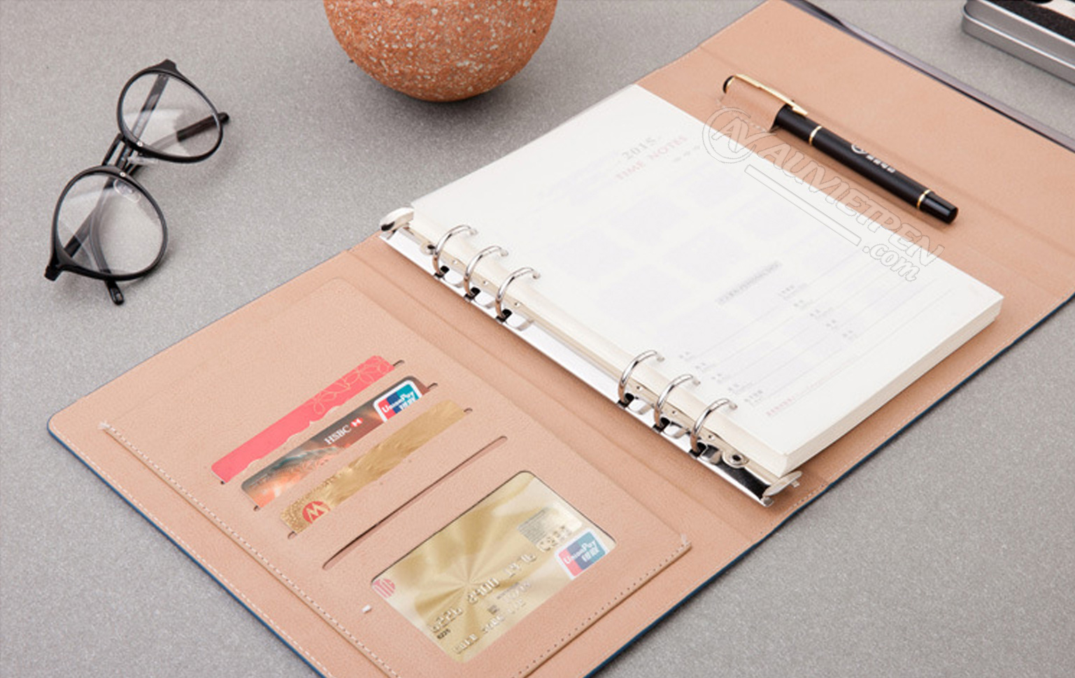 Là dòng Sổ Da Cao Cấp nên SDC-07 không thể thiếu được những chi tiết gài Name card và gài bút tiện lợi cho người sử dụng. Thiết kế bên trong với mẫu còng 6 lỗ, bạn dễ dàng thay giấy khi đã viết hết.